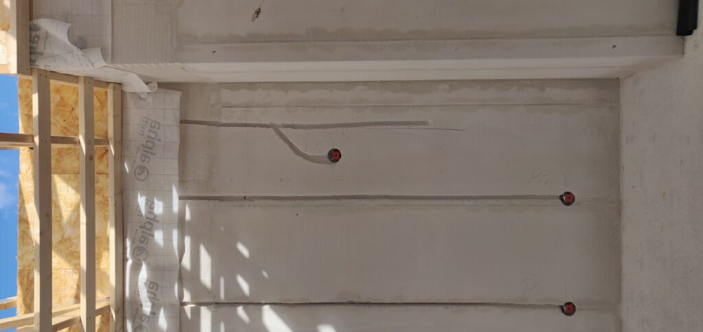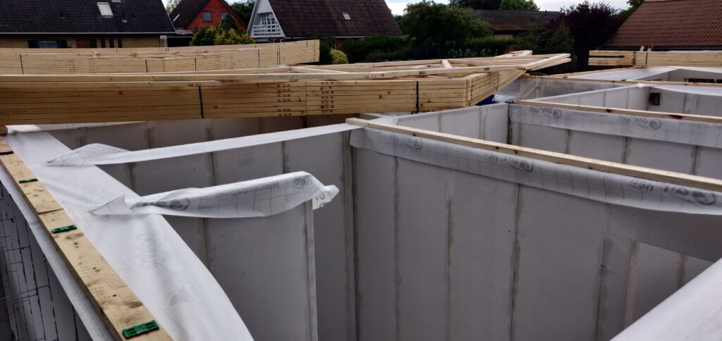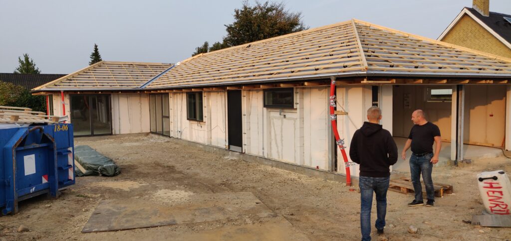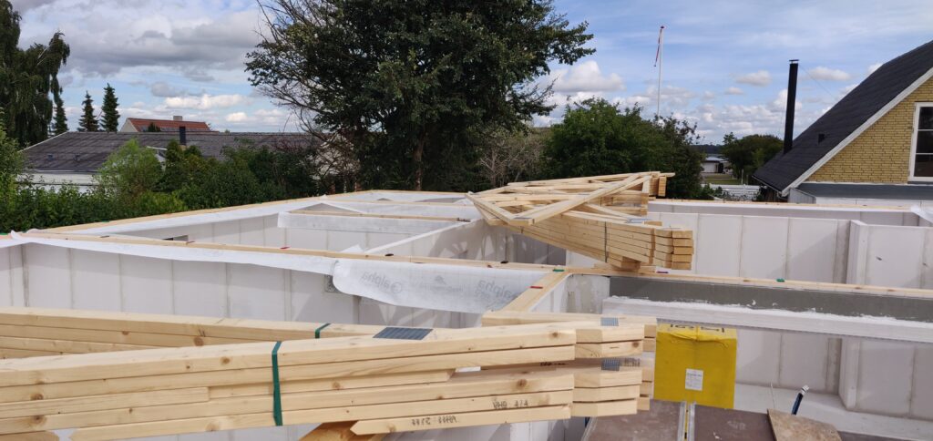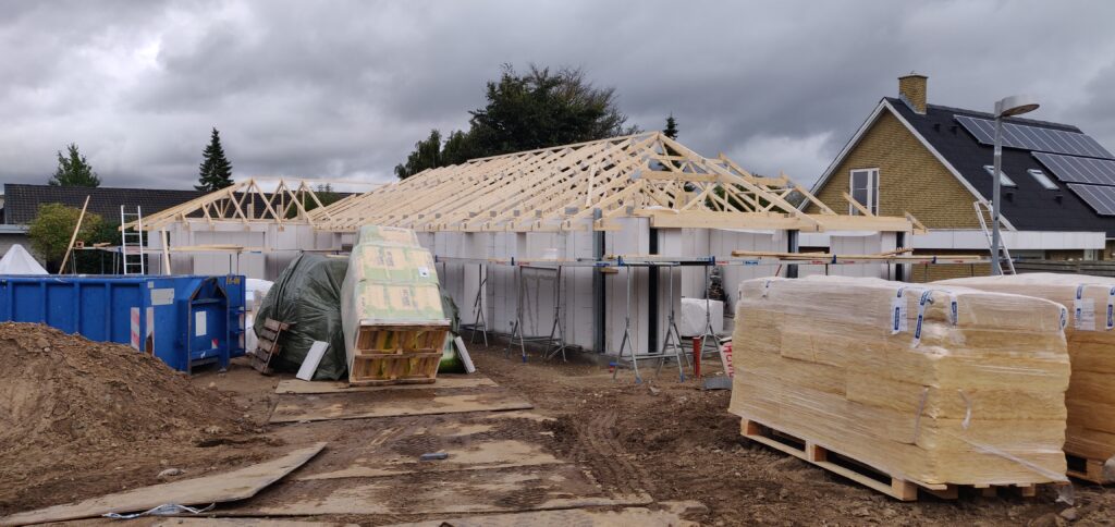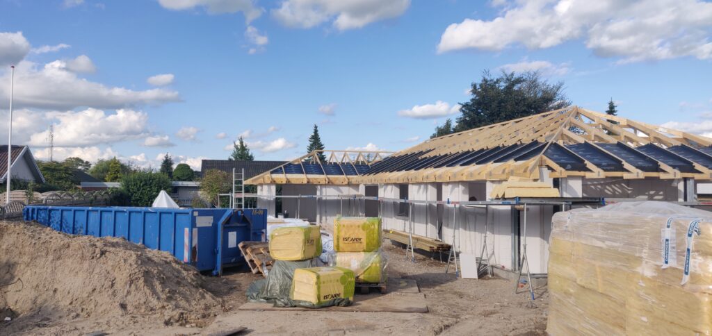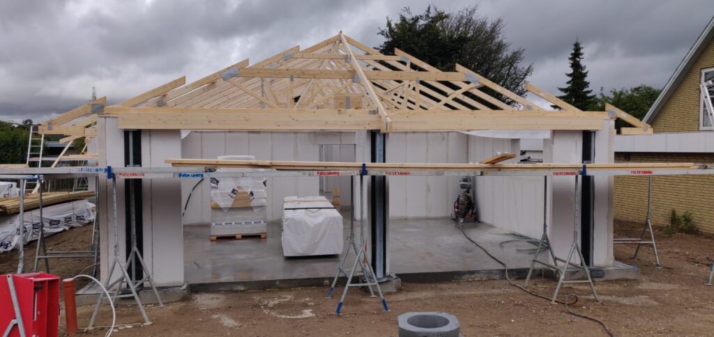 Tagkonstruktionen er nu næsten færdig (minus tagsten og solceller), og der er idag blevet sat vinduer i huset.