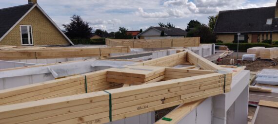 Trods det dårlige vejr, har tømrene haft travlt, og der er her til eftermiddag næsten rejst en hel tagkonstruktion.